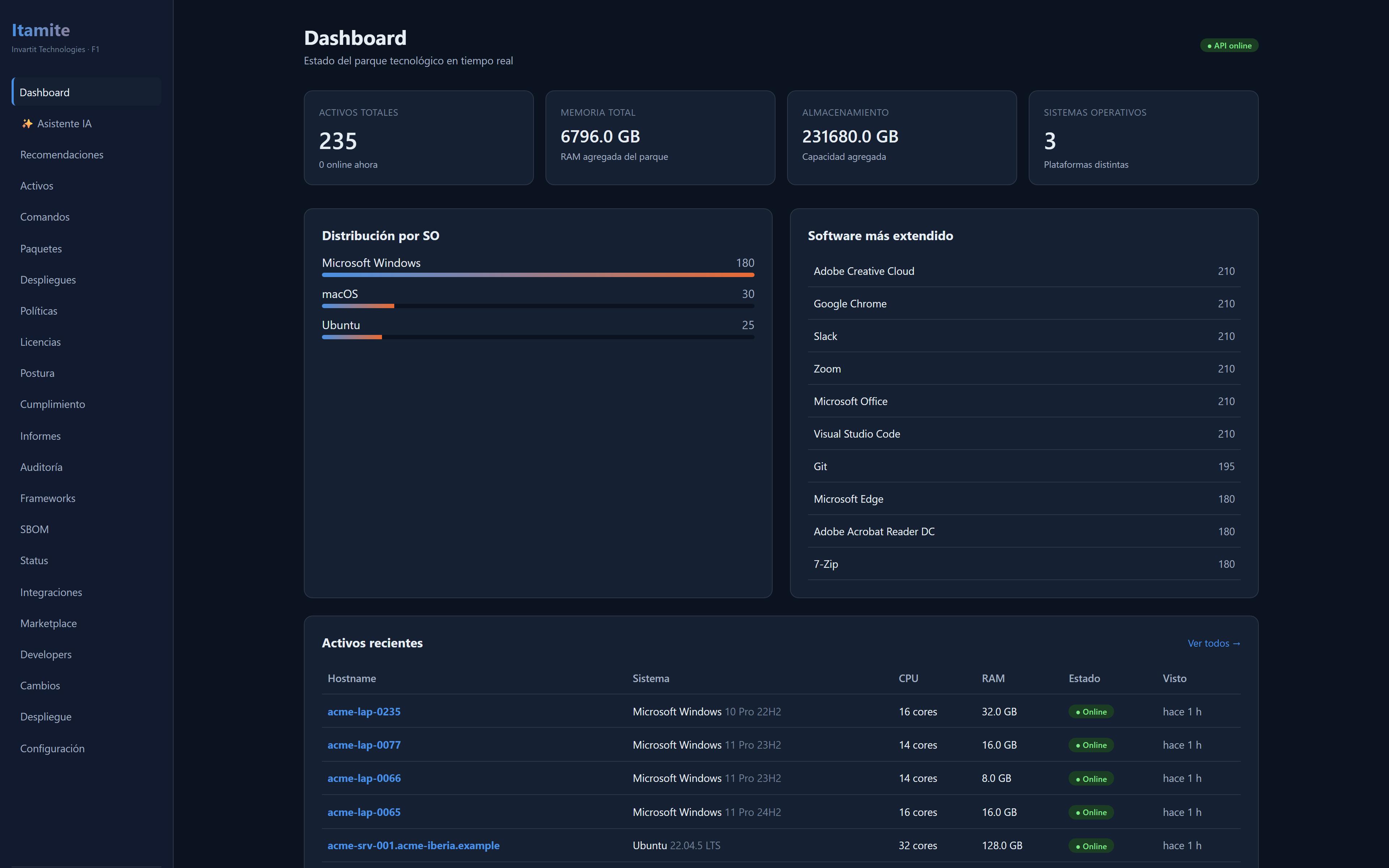 Real-time fleet KPIs, OS breakdown and most widespread software.